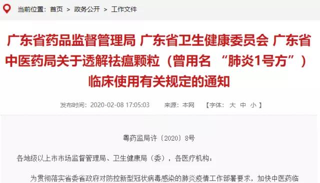 2月8日,廣東省藥品監(jiān)督管理局官網(wǎng)發(fā)布最新消息,同意廣州市第八人民醫(yī)院申報的透解祛瘟顆粒(曾用名“肺炎1號方”)用于全省30家新型冠狀病毒感染的肺炎定點救治醫(yī)院臨床使用。非定點醫(yī)院申請調(diào)劑使用,將由省藥監(jiān)局予以優(yōu)先審批。
