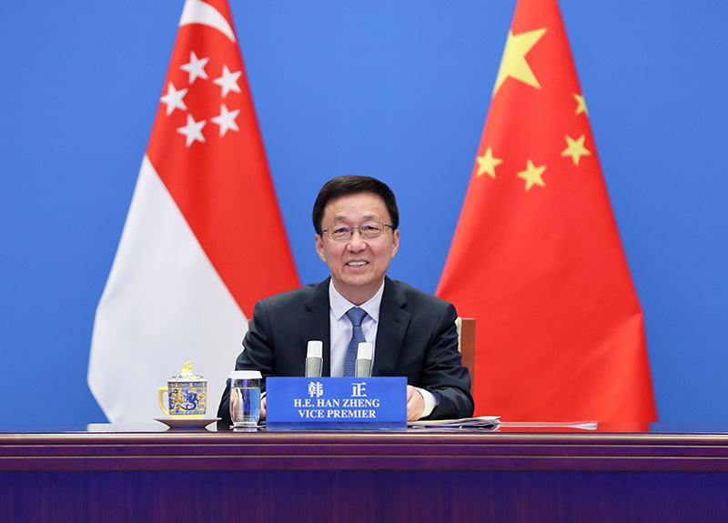 12月29日,中共中央政治局常委、國務(wù)院副總理韓正在北京同新加坡副總理王瑞杰舉行視頻會見,并共同主持中新雙邊合作聯(lián)委會第十七次會議、蘇州工業(yè)園區(qū)聯(lián)合協(xié)調(diào)理事會第二十二次會議、天津生態(tài)城聯(lián)合協(xié)調(diào)理事會第十三次會議、中新(重慶)戰(zhàn)略性互聯(lián)互通示范項(xiàng)目聯(lián)合協(xié)調(diào)理事會第五次會議。新華社記者 丁海濤 攝