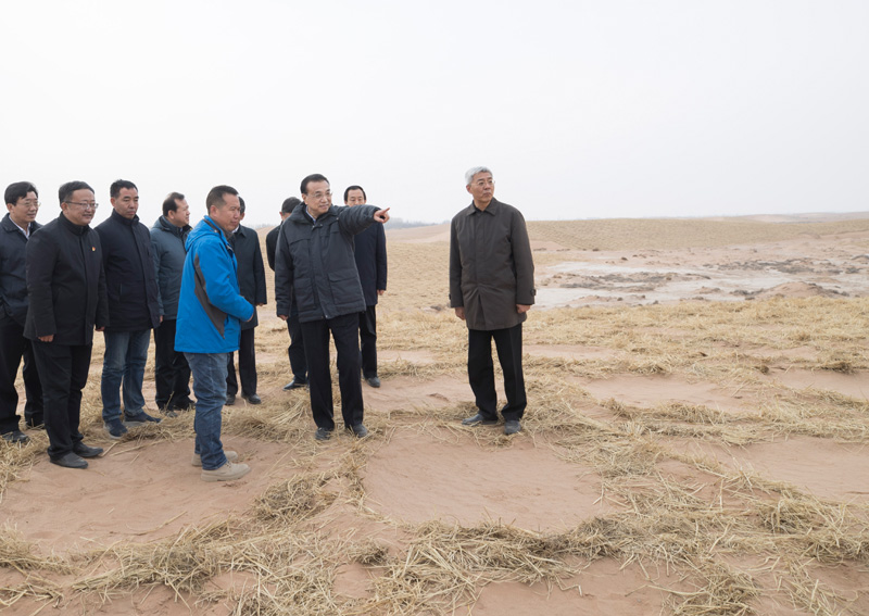 1月27日至28日,春節(jié)前夕,中共中央政治局常委、國(guó)務(wù)院總理李克強(qiáng)在甘肅金昌、武威考察。這是1月27日,李克強(qiáng)在武威市民勤縣草方格固沙點(diǎn)聽取甘肅防沙治沙工作匯報(bào)。新華社記者 王曄 攝