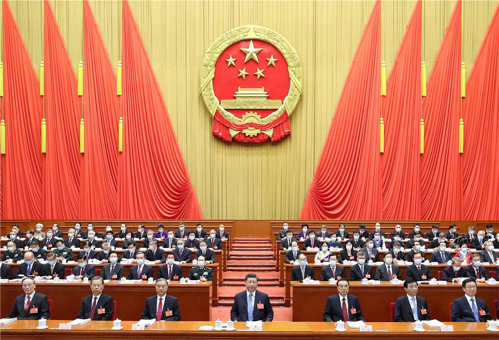 習(xí)近平、李克強(qiáng)、汪洋、王滬寧、趙樂(lè)際、韓正、王岐山和大會(huì)主席團(tuán)成員在主席臺(tái)就座。