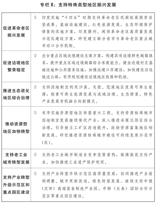 二是提高區(qū)域協(xié)調發(fā)展水平。推動西部大開發(fā)形成新格局,發(fā)揮風、光、水電和礦產(chǎn)資源優(yōu)勢建設大型清潔能源基地。積極發(fā)展文化和旅游產(chǎn)業(yè)。實施重要生態(tài)系統(tǒng)保護和修復工程,加快重大項目規(guī)劃建設。推進貴州大數(shù)據(jù)綜合試驗區(qū)建設。積極穩(wěn)妥推進雅魯藏布江下游水電開發(fā)等重大工程。推動東北振興取得新突破,組織實施好東北全面振興“十四五”實施方案,繼續(xù)推進黑瞎子島中俄國際合作示范區(qū)建設,積極推動大小興安嶺林區(qū)生態(tài)保護與經(jīng)濟轉型,穩(wěn)步推進長吉圖開發(fā)開放先導區(qū)發(fā)展,推動《東北振興重點項目三年滾動實施方案》重點項目加快建設。推動中部地區(qū)高質量發(fā)展,推動湘鄂贛協(xié)同高質量發(fā)展,支持晉陜豫黃河金三角承接產(chǎn)業(yè)轉移示范區(qū)建設,支持山西進一步深化能源革命綜合改革試點,推進淮海合作區(qū)協(xié)同發(fā)展,支持中國(武漢)光谷建設,編制出臺洞庭湖生態(tài)經(jīng)濟區(qū)規(guī)劃。鼓勵東部加快高質量發(fā)展,支持福建高質量發(fā)展及平潭綜合實驗區(qū)建設,推動山東新舊動能轉換綜合試驗區(qū)建設取得新進展。支持民族地區(qū)改善生產(chǎn)生活條件,加強各民族交流交往交融,鑄牢中華民族共同體意識。推動革命老區(qū)、邊境地區(qū)、生態(tài)退化地區(qū)、資源型地區(qū)、老工業(yè)城市等特殊類型地區(qū)振興發(fā)展,推進國家級新區(qū)、臨空經(jīng)濟示范區(qū)、承接產(chǎn)業(yè)轉移示范區(qū)等功能平臺建設,推動國家自主創(chuàng)新示范區(qū)和高新區(qū)高質量發(fā)展。支持海洋經(jīng)濟發(fā)展示范區(qū)、現(xiàn)代海洋城市等建設,提升海洋資源開發(fā)利用水平。