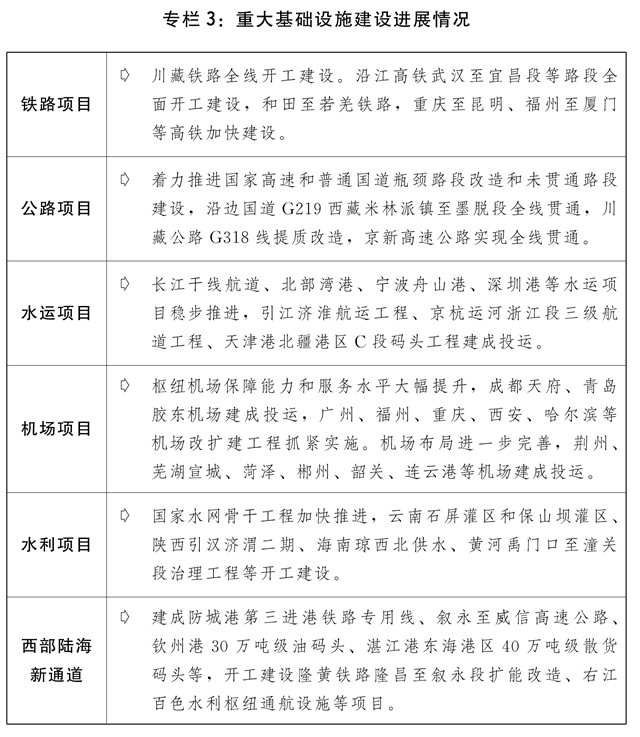 四是適度超前開展重大基礎設施建設。精準有效推進交通、水利、物流、能源、新型基礎設施、民生等領域重大基礎設施項目建設。推進川藏鐵路、西部陸海新通道、沿江高鐵、一批鐵路專用線重點項目和川藏公路G318線提質改造等加快建設。整體推進京津冀、長三角、粵港澳大灣區(qū)城市群城際鐵路、市域(郊)鐵路建設。鼓勵推廣軌道交通+土地綜合開發(fā)模式經(jīng)驗。做好中長期鐵路網(wǎng)、國家公路網(wǎng)和全國港口與航道布局規(guī)劃修編,強化國家公路、港口和高等級航道網(wǎng)絡功能。推動三峽水運新通道研究論證。實施國家水網(wǎng)重大工程。加快發(fā)展公鐵水多式聯(lián)運。提升樞紐機場綜合保障能力和服務水平,加快培育支線航空市場,提高國際航空貨運能力。加快“支點城市+骨干走廊”現(xiàn)代流通網(wǎng)絡建設。穩(wěn)步推進國家物流樞紐、國家骨干冷鏈物流基地建設,強化冷鏈運輸環(huán)節(jié)疫情防控措施,完善“321”冷鏈物流運行體系。加快物流業(yè)制造業(yè)融合創(chuàng)新發(fā)展,積極推動多式聯(lián)運、智慧物流等新業(yè)態(tài)新模式發(fā)展。布局一批新型基礎設施項目,加快推進5G、千兆光網(wǎng)、一體化大數(shù)據(jù)中心、北斗產(chǎn)業(yè)化重大工程、民用空間基礎設施等建設,推動傳統(tǒng)基礎設施智能化改造。