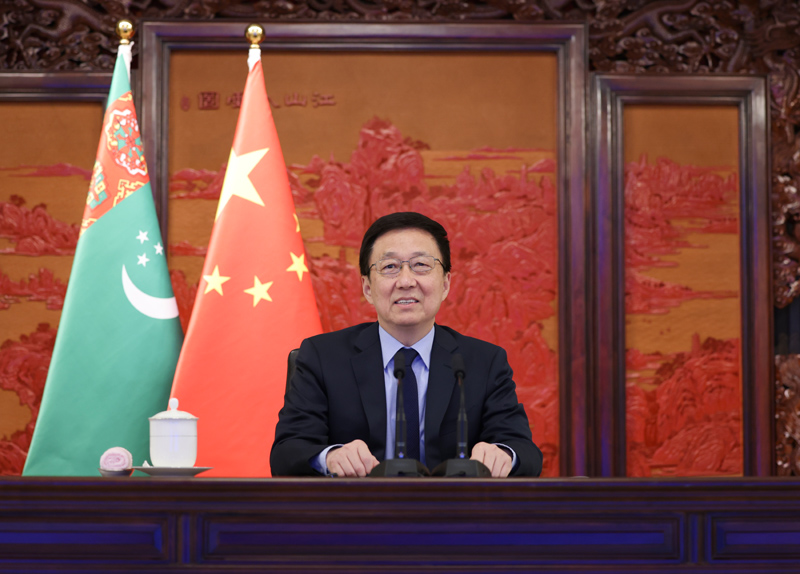 3月30日,中共中央政治局常委、國(guó)務(wù)院副總理、中土合作委員會(huì)中方主席韓正在北京通過視頻方式會(huì)晤來華訪問的土庫(kù)曼斯坦副總理兼外長(zhǎng)、中土合作委員會(huì)土方主席梅列多夫。新華社記者 丁海濤 攝