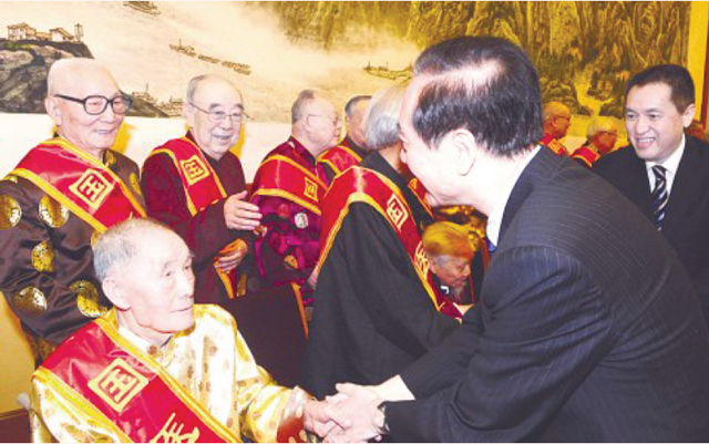 △表彰大會(huì)上,韓啟德(前右)、張茅(后右一)等領(lǐng)導(dǎo)與國(guó)醫(yī)大師任繼學(xué)(前左)等親切握手。
