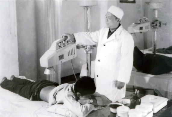 這張老照片拍攝于上世紀(jì)70年代末,距今已經(jīng)40余年,照片上是孫復(fù)猷老中醫(yī)在操作由他發(fā)明的中藥熨療器為患者治病的情形。