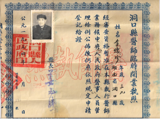 “家父幼年學(xué)醫(yī),新中國(guó)成立前就獨(dú)立門戶,開辦一家私人中醫(yī)診所,醫(yī)名已然遠(yuǎn)播,每天前來(lái)求診的患者很多,不僅有洞口縣縣內(nèi)的,還有鄰近武岡、邵陽(yáng)的,甚至還有省會(huì)長(zhǎng)沙的??h里成立中醫(yī)院之前,縣衛(wèi)生科領(lǐng)導(dǎo)上門征詢父親意見,問他愿不愿意參加新中國(guó)的中醫(yī)院建設(shè),他二話沒說(shuō)就同意了,并且馬上關(guān)閉了自家的診所,到縣中醫(yī)院當(dāng)了一名坐堂醫(yī)生,一當(dāng)就當(dāng)?shù)酵诵荨?rdquo;李志和如是介紹其父李儒珍這張執(zhí)照背后的故事。
