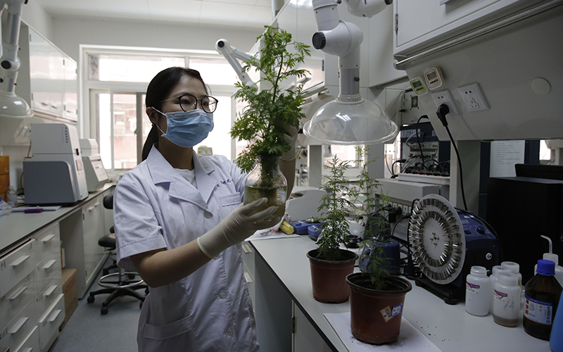 研究人員觀察培育的青蒿。新京報記者 侯少卿 攝