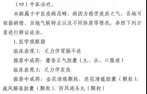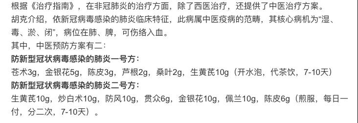連花清瘟、抗病毒口服液、金花清感、藿香正氣、熱毒寧、清瘟敗毒散等,及喜炎平、血必凈、參附和生脈4種注射液,都作為有抗病毒作用的中藥組分納入診療推薦方案中。