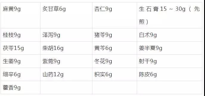 清肺排毒湯是中醫(yī)經(jīng)典方劑組合,包括了麻杏石甘湯、射干麻黃湯、小柴胡湯、五苓散,由21味藥物組成,包括麻黃、炙甘草、杏仁、生石膏(先煎)、桂枝、澤瀉、豬苓、白術(shù)、茯苓、柴胡、黃芩、姜半夏、生姜、紫菀、冬花、射干、細(xì)辛、山藥、枳實(shí)、陳皮、藿香,水煎服,一天一服,3服一個(gè)療程,早晚兩次(飯后40分鐘),溫服。