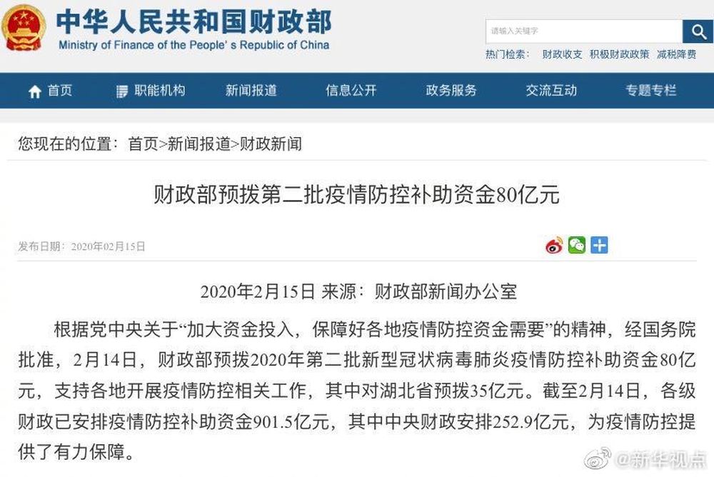 #新型冠狀病毒感染肺炎#【財政部預(yù)撥第二批疫情防控補助資金80億元】記者15日從財政部獲悉,財政部14日預(yù)撥2020年第二批新型冠狀病毒肺炎疫情防控補助資金80億元,支持各地開展疫情防控相關(guān)工作,其中對湖北省預(yù)撥35億元。截至14日,各級財政已安排疫情防控補助資金901.5億元。(記者申鋮)