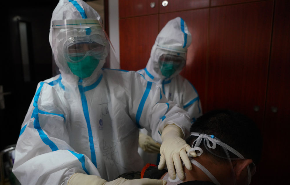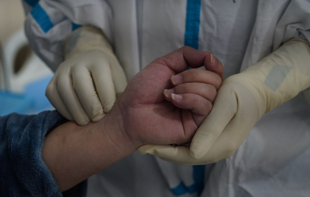 ↑2月18日,在江西中醫(yī)藥大學附屬醫(yī)院隔離病房,醫(yī)護人員為一名患者把脈。