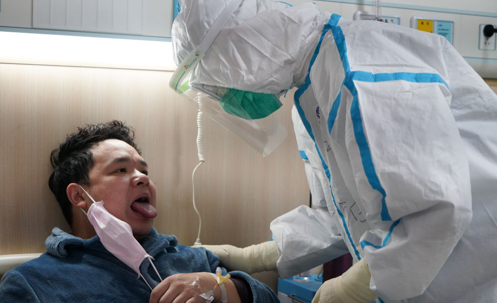 ↑2月18日,在江西中醫(yī)藥大學附屬醫(yī)院隔離病房,醫(yī)護人員通過觀察患者舌苔了解病情。