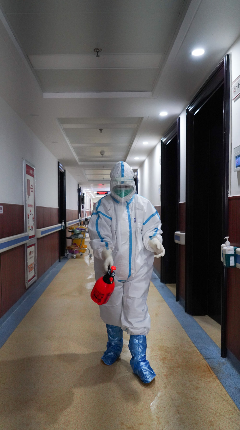 ↑2月18日,在江西中醫(yī)藥大學附屬醫(yī)院隔離病房,醫(yī)護人員在病區(qū)走廊實施消毒殺菌處理。