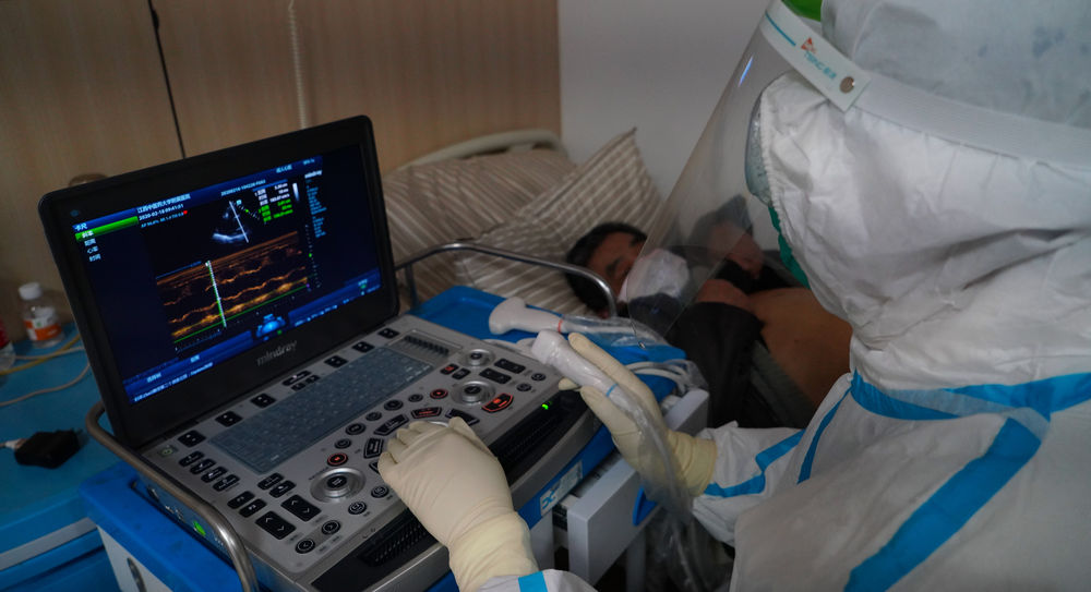 ↑2月18日,在江西中醫(yī)藥大學附屬醫(yī)院隔離病房,醫(yī)護人員運用彩超機為患者提供床旁超聲服務,檢測患者病情。