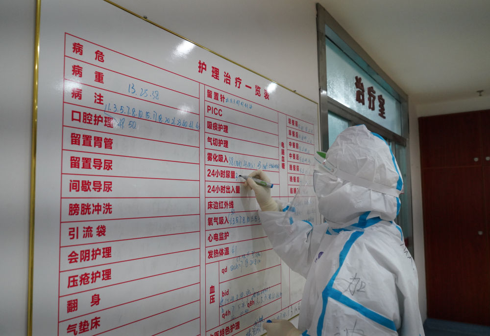 ↑2月18日,在江西中醫(yī)藥大學附屬醫(yī)院隔離病房,醫(yī)護人員在登記患者最新的護理以及治療情況。