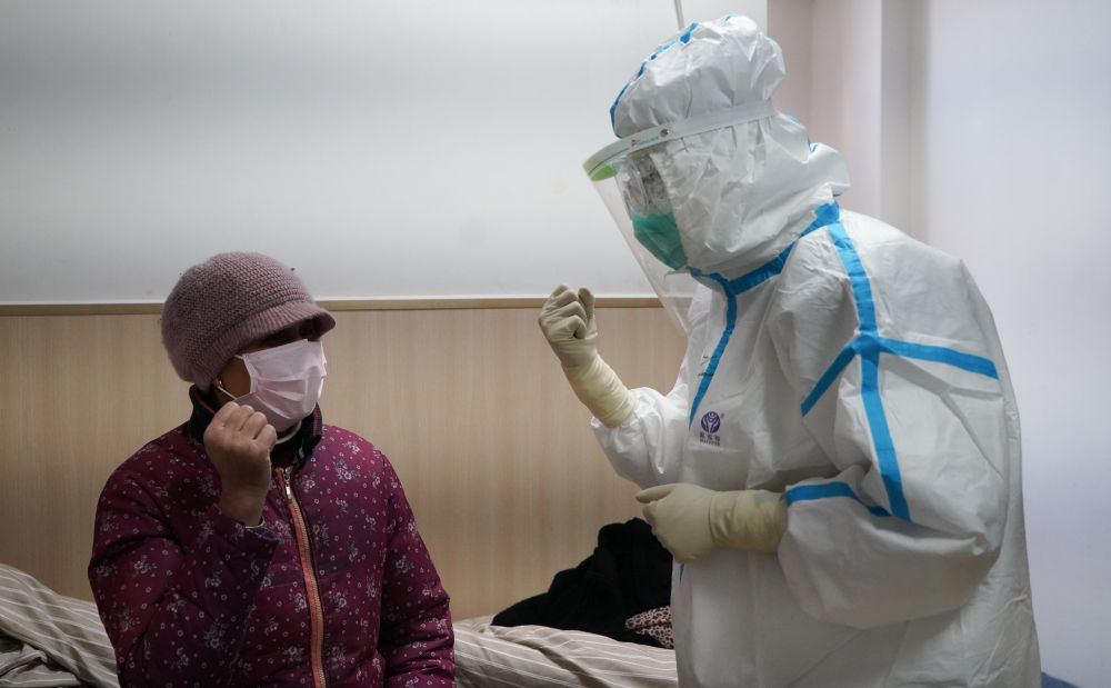 ↑2月18日,在江西中醫(yī)藥大學附屬醫(yī)院隔離病房,醫(yī)護人員在病床邊鼓勵一名患者。
