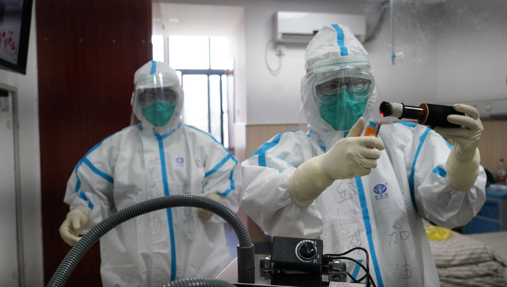 ↑2月18日,在江西中醫(yī)藥大學附屬醫(yī)院隔離病房,醫(yī)護人員運用熱敏灸療法為患者治療。