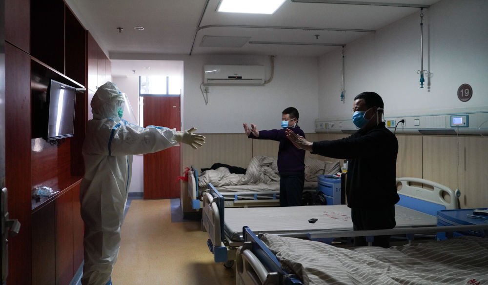 ↑2月18日,在江西中醫(yī)藥大學附屬醫(yī)院隔離病房,醫(yī)護人員指導患者開展運動療法,平復心情,增強體質,緩解壓力。