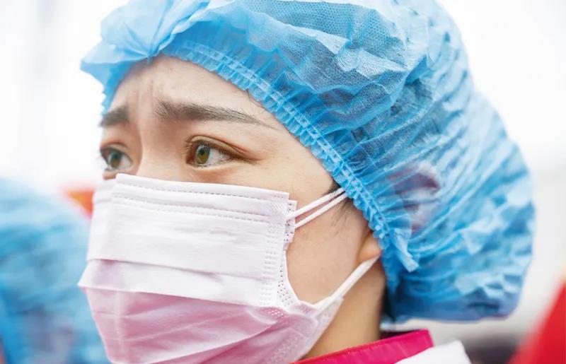 2020年3月29日,在武漢雷神山醫(yī)院舉行的集中撤離儀式上,來自大連醫(yī)科大學(xué)附屬第一醫(yī)院的護(hù)士熱淚盈眶。當(dāng)日,武漢雷神山醫(yī)院舉行首批外省醫(yī)療隊(duì)集中撤離儀式,送別即將踏上歸途的遼寧、上海、吉林、廣東、山西、河北醫(yī)療隊(duì)的1090名醫(yī)護(hù)人員。新華社記者 才揚(yáng)/攝