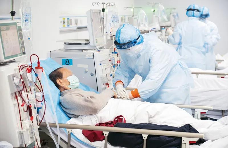 2020年3月21日,在武漢市漢口醫(yī)院腎內(nèi)科血液透析室,醫(yī)護(hù)人員為處于新冠肺炎康復(fù)期的尿毒癥患者做血液透析。新華社記者 才揚(yáng)/攝
