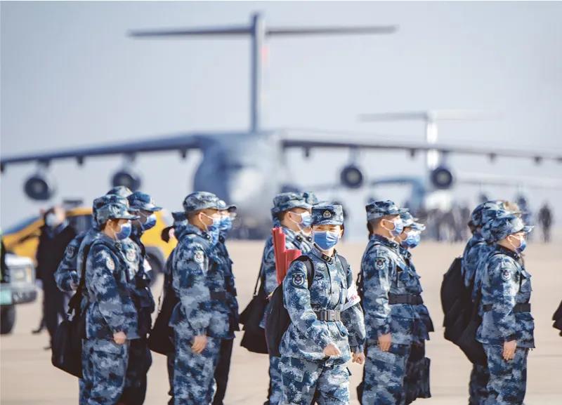 2020年2月17日,中國人民解放軍空軍再次出動運(yùn)-20等三型多架運(yùn)輸機(jī),從上海虹橋等7個(gè)機(jī)場起飛,向武漢緊急空運(yùn)軍隊(duì)支援湖北醫(yī)療隊(duì)676名隊(duì)員和50噸醫(yī)療物資。湖北日報(bào)全媒記者 魏錸/攝
