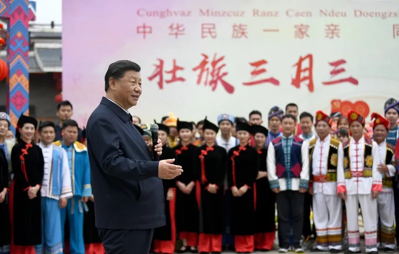 廣西是我國少數(shù)民族人口最多的自治區(qū)。27日上午,習(xí)近平來到位于南寧市邕江之畔的廣西民族博物館,參觀壯族文化展。博物館外,三月三“歌圩節(jié)”壯族對(duì)歌等民族文化活動(dòng)正在這里集中展示。習(xí)近平強(qiáng)調(diào),廣西是全國民族團(tuán)結(jié)進(jìn)步示范區(qū),要繼續(xù)發(fā)揮好示范帶動(dòng)作用。各民族共同團(tuán)結(jié)進(jìn)步、共同繁榮發(fā)展是中華民族的生命所在、力量所在、希望所在,在全面建設(shè)社會(huì)主義現(xiàn)代化國家的新征程上,一個(gè)民族都不能少,各族人民要心手相牽、團(tuán)結(jié)奮進(jìn),共創(chuàng)中華民族的美好未來,共享民族復(fù)興的偉大榮光。