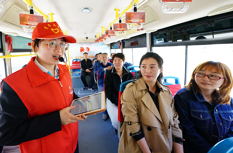 河北省唐山市海港經(jīng)濟(jì)開(kāi)發(fā)區(qū)志愿者宣講員在紅色主題公交車上給乘客講革命故事(5月10日攝)。新華社記者 楊世堯 攝