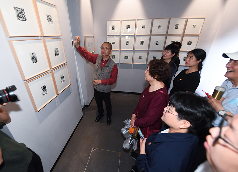 觀眾在位于浙江省杭州市臨安區(qū)高虹鎮(zhèn)的高虹新四軍紅色文化體驗(yàn)館欣賞革命主題版畫(huà)作品(5月30日攝)。新華社記者 徐昱 攝
