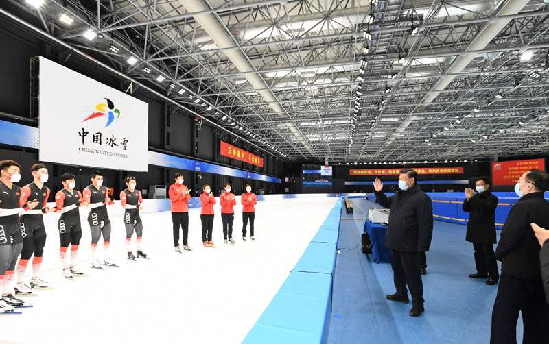 1月4日,中共中央總書記、國家主席、中央軍委主席習近平在北京考察2022年冬奧會、冬殘奧會籌辦備賽工作。這是4日下午,習近平在二七廠冰雪項目訓練基地速滑館,向參訓運動員、教練員表示慰問。新華社記者 謝環(huán)馳 攝