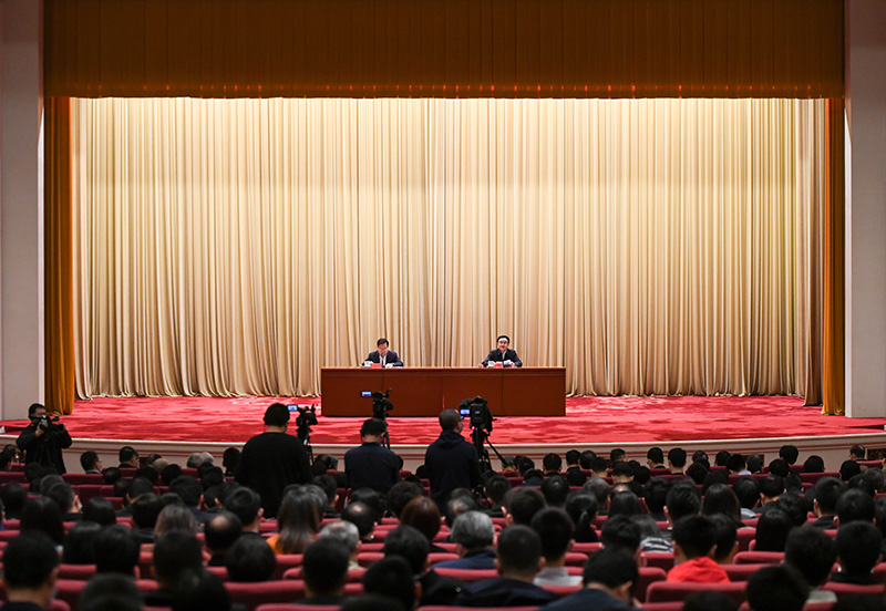 2021年3月16日,黨史學習教育中央宣講團首場報告會在北京舉行。這是中央宣講團成員、中央黨史和文獻研究院院長曲青山(右)在報告會上作宣講報告。新華社記者 陳曄華 攝