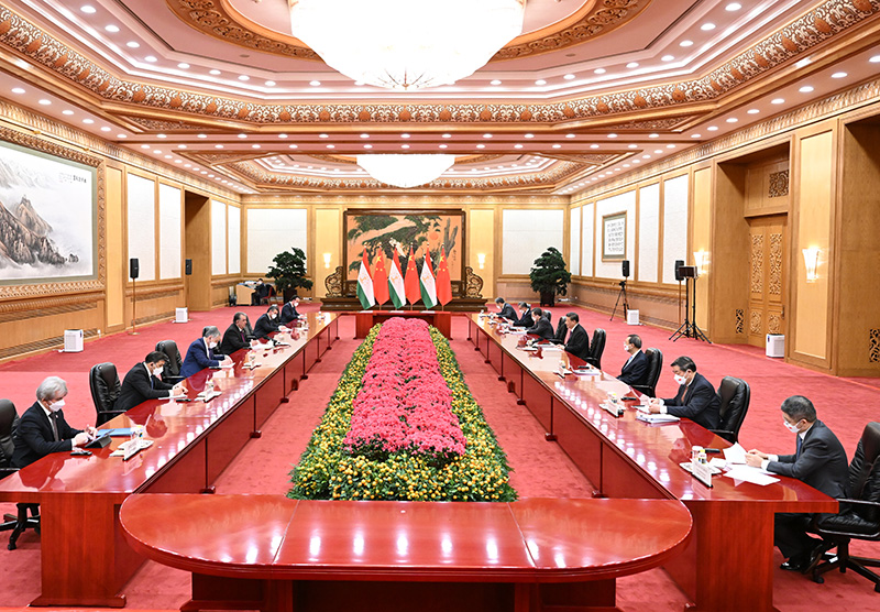 2月5日下午,國家主席習近平在北京人民大會堂會見來華出席北京2022年冬奧會開幕式的塔吉克斯坦總統(tǒng)拉赫蒙。新華社記者 申宏 攝