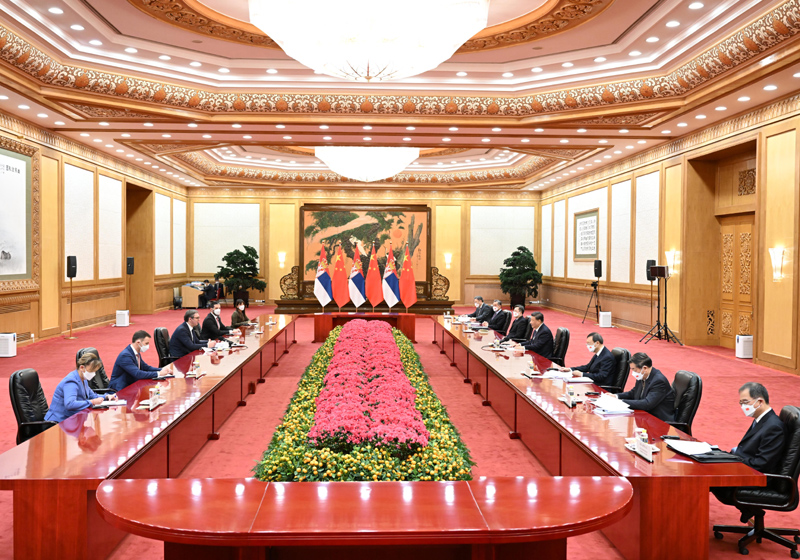 2月5日上午,國家主席習(xí)近平在北京人民大會堂會見來華出席北京2022年冬奧會開幕式的塞爾維亞總統(tǒng)武契奇。新華社記者 李響 攝