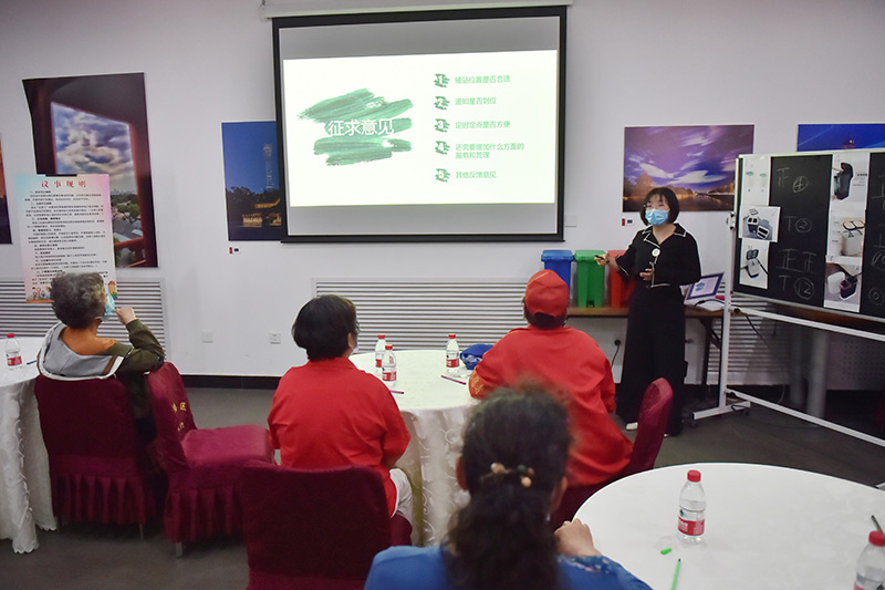 在北京建國門街道趙家樓社區(qū)議事廳舉行的“兩桶一袋”居民征求意見懇談會上,來自社區(qū)的12位垃圾分類達人對“兩桶”款式進行投票選擇,同時,街道針對桶站位置、定時定點投放等垃圾分類運營管理聽取居民意見(2020年5月2日攝)。新華社記者 彭子洋 攝