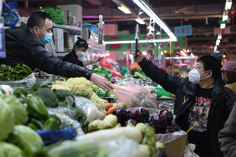 3月25日,在遼寧省沈陽市鳳祥綜合市場,一名市民買菜后掃碼付款。新華社記者 王乙杰 攝