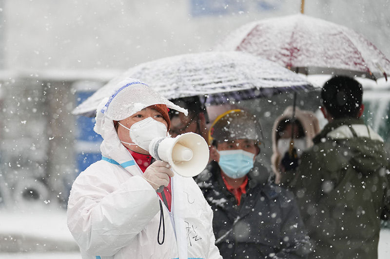 3月18日,在北京市東城區(qū)北新橋街道一處核酸采樣點,工作人員冒雪引導(dǎo)前來檢測的居民。新華社記者 鞠煥宗 攝