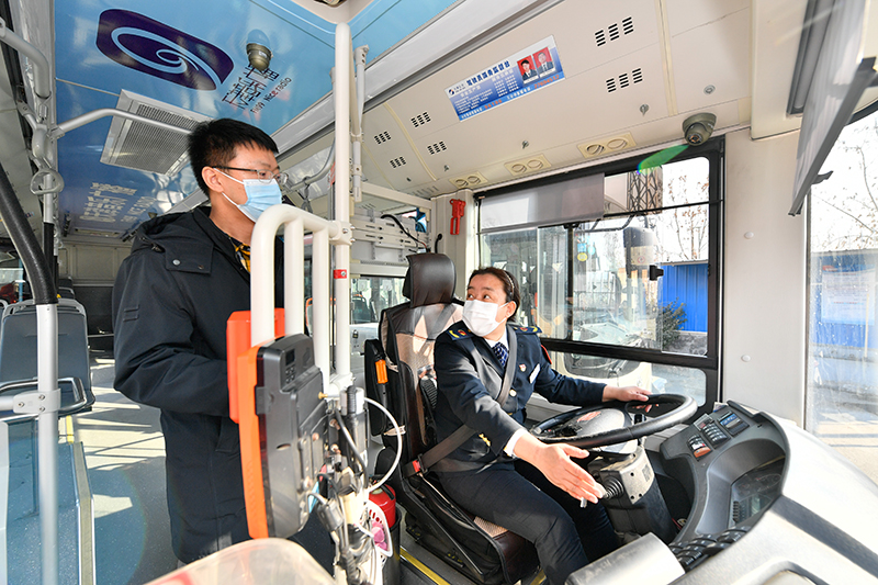 全國人大代表、天津市公交集團第三客運有限公司8路車隊駕駛員王艷(右)與徒弟劉彬交流(2月24日攝)。新華社記者 孫凡越 攝