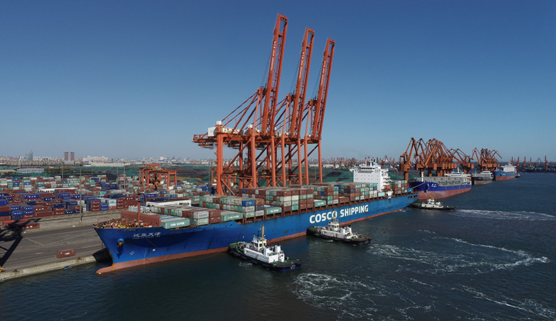 一艘輪船在拖輪的協(xié)助下向唐山港京唐港區(qū)集裝箱碼頭靠泊(2021年10月23日攝,無人機照片)。新華社記者 朱旭東 攝