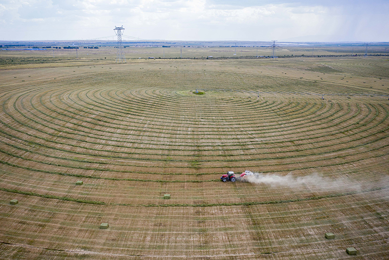 在寧夏鹽池縣馮記溝鄉(xiāng)平臺村的優(yōu)質(zhì)牧草基地,農(nóng)戶用機械將牧草打捆(無人機照片,2021年7月14日攝)。新華社記者 楊植森 攝