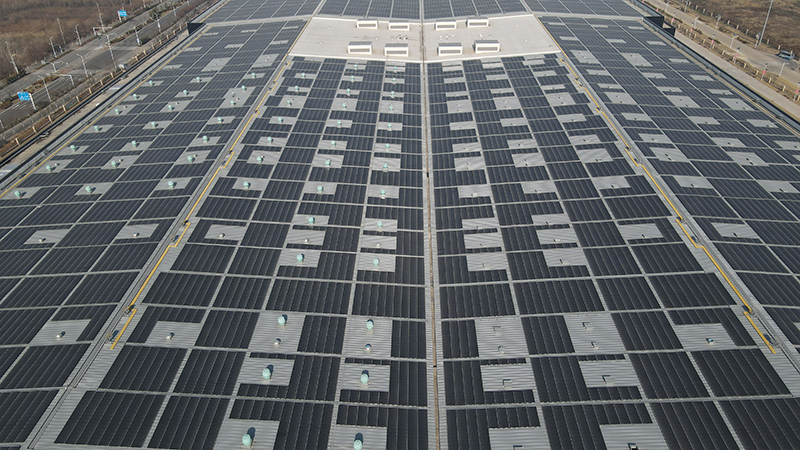 這是位于蚌埠中光電科技有限公司內(nèi)的薄膜光伏建筑一體化應(yīng)用示范項目(2021年12月21日攝,無人機照片)。新華社記者 張端 攝