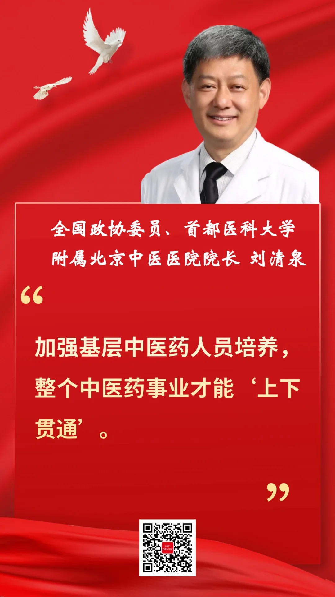 全國(guó)兩會(huì)期間,全國(guó)政協(xié)委員、首都醫(yī)科大學(xué)附屬北京中醫(yī)醫(yī)院院長(zhǎng)劉清泉圍繞中醫(yī)藥人才隊(duì)伍建設(shè)等議題,積極建言獻(xiàn)策。