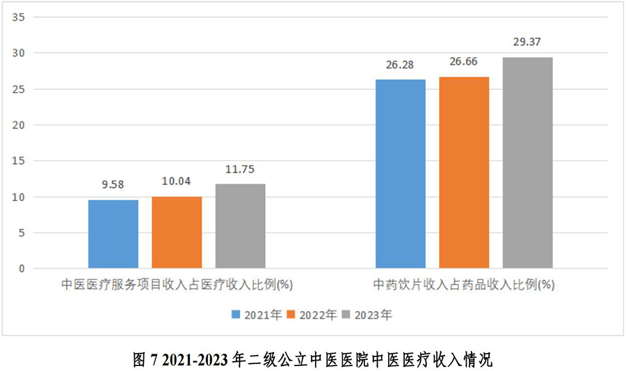在中醫(yī)醫(yī)療收入方面。2023年,全國(guó)二級(jí)公立中醫(yī)醫(yī)院中醫(yī)醫(yī)療服務(wù)項(xiàng)目收入(不含中藥收入)占醫(yī)療收入比例為11.75%,較2022年提升1.71個(gè)百分點(diǎn);中藥飲片收入占藥品收入比例為29.37%,較2022年增長(zhǎng)2.71個(gè)百分點(diǎn)(見(jiàn)圖7)。