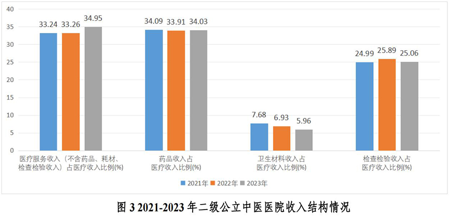 二是持續(xù)推進(jìn)體現(xiàn)以醫(yī)療服務(wù)為主導(dǎo)的價(jià)格改革,收支結(jié)構(gòu)不斷優(yōu)化。2023年,全國(guó)二級(jí)公立中醫(yī)醫(yī)院醫(yī)療服務(wù)收入(不含藥品、耗材、檢查檢驗(yàn)收入)占醫(yī)療收入比例為34.95%,較2022年提升1.69個(gè)百分點(diǎn),衛(wèi)生材料、檢查檢驗(yàn)收入占醫(yī)療收入比例分別為5.96%和25.06%,較2022年下降0.97、0.83個(gè)百分點(diǎn),藥品收入占醫(yī)療收入比例基本保持穩(wěn)定(見(jiàn)圖3)。其中重點(diǎn)監(jiān)控高值醫(yī)用耗材收入占比為24.89%,較2022年下降6.86個(gè)百分點(diǎn)。