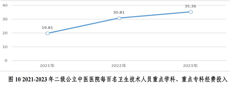 二是人才培養(yǎng)和重點(diǎn)學(xué)科、重點(diǎn)??平ㄔO(shè)經(jīng)費(fèi)投入逐年增長(zhǎng)。2023年,二級(jí)公立中醫(yī)醫(yī)院人才培養(yǎng)經(jīng)費(fèi)投入總金額為5.6億,較2022年增加26.08%,人才培養(yǎng)經(jīng)費(fèi)投入占比為0.31%,較2022年增長(zhǎng)0.06個(gè)百分點(diǎn);每百名衛(wèi)生技術(shù)人員重點(diǎn)學(xué)科、重點(diǎn)專科經(jīng)費(fèi)投入為35.36萬(wàn)元,較2022年增加4.55萬(wàn)元(見(jiàn)圖10)。二級(jí)公立中醫(yī)醫(yī)院不斷增加人才培養(yǎng)及重點(diǎn)學(xué)科、重點(diǎn)??平?jīng)費(fèi)投入,為推進(jìn)中醫(yī)藥人才隊(duì)伍建設(shè)和中醫(yī)優(yōu)勢(shì)??平ㄔO(shè)創(chuàng)造條件。