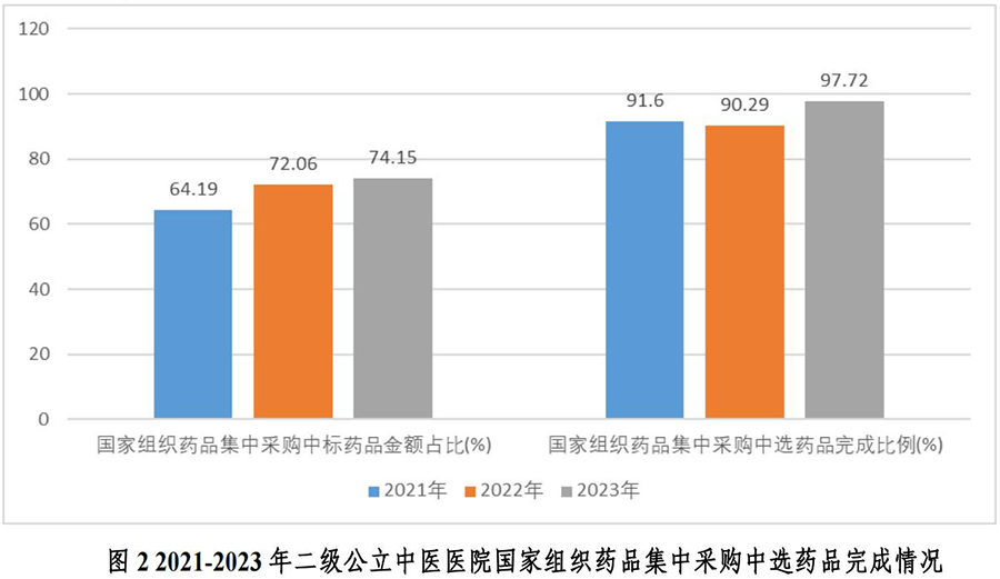 一是積極推進(jìn)藥品集中采購(gòu),完善醫(yī)療、醫(yī)保、醫(yī)藥協(xié)同機(jī)制。2023年,全國(guó)二級(jí)公立中醫(yī)醫(yī)院國(guó)家組織藥品集中采購(gòu)中標(biāo)藥品金額占比和中選藥品完成比例分別為74.15%、97.72%,較2022年增加2.09、7.43個(gè)百分點(diǎn)(見(jiàn)圖2)。