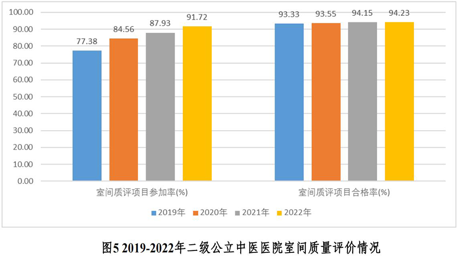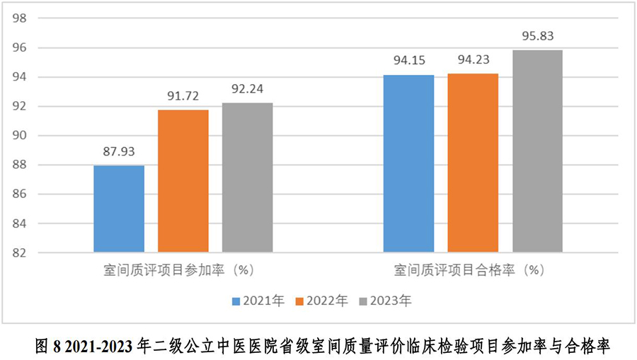 三是臨床檢查檢驗(yàn)可比性持續(xù)提升。2023年,全國(guó)二級(jí)公立中醫(yī)醫(yī)院省級(jí)室間質(zhì)量評(píng)價(jià)臨床檢驗(yàn)項(xiàng)目參加率與合格率分別為92.24%和95.83%,較2022年分別提升0.52個(gè)和1.60個(gè)百分點(diǎn)(見(jiàn)圖8)。