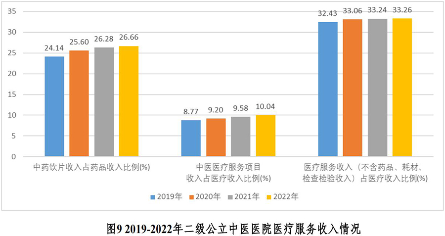 三是中醫(yī)藥服務(wù)收入占比不斷提高。2022年,全國(guó)二級(jí)公立中醫(yī)醫(yī)院中醫(yī)醫(yī)療服務(wù)項(xiàng)目收入(不含中藥收入)占醫(yī)療收入比例為10.04%,較2021年提高0.46個(gè)百分點(diǎn);中藥飲片收入占藥品收入比例為26.66%,較2021年提高0.38個(gè)百分點(diǎn)(見(jiàn)圖9)。中醫(yī)醫(yī)療服務(wù)項(xiàng)目收入占比和中藥飲片收入占比持續(xù)提升,中醫(yī)藥診療服務(wù)優(yōu)勢(shì)和積極性在二級(jí)公立中醫(yī)醫(yī)院進(jìn)一步得到彰顯。