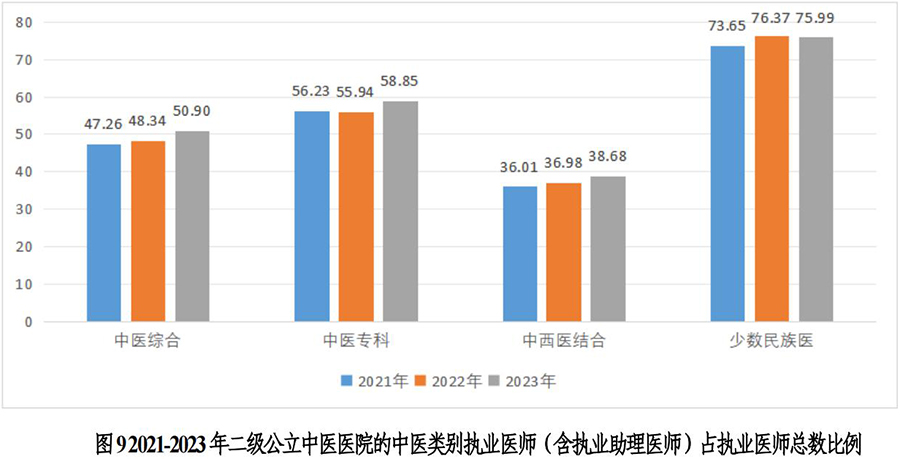 一是專業(yè)技術(shù)人員結(jié)構(gòu)不斷優(yōu)化。2023年,全國(guó)二級(jí)公立中醫(yī)醫(yī)院的中醫(yī)類別執(zhí)業(yè)醫(yī)師(含執(zhí)業(yè)助理醫(yī)師)占執(zhí)業(yè)醫(yī)師總數(shù)比例為51.73%,較2022年提升2.43個(gè)百分點(diǎn),中醫(yī)綜合醫(yī)院、中醫(yī)??漆t(yī)院、中西醫(yī)結(jié)合醫(yī)院的中醫(yī)類別醫(yī)師占比分別為50.90%、58.85%、38.68%,較2022年增長(zhǎng)2.56、2.91、1.70個(gè)百分點(diǎn)(見(jiàn)圖9)。此外,重癥、病理、感染性疾病科醫(yī)師數(shù)量和占比均較2022年有一定增長(zhǎng),重癥、病理、感染性疾病科醫(yī)師等急需緊缺專業(yè)人才隊(duì)伍逐步壯大。
