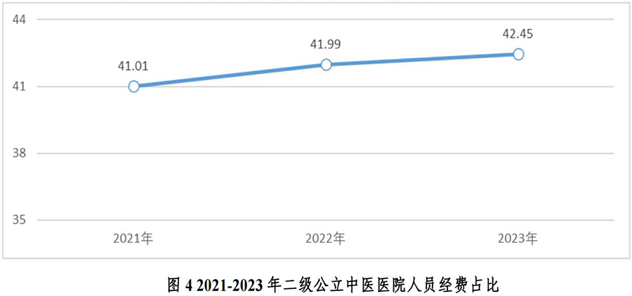三是進(jìn)一步推動(dòng)中醫(yī)醫(yī)院薪酬制度改革,人員經(jīng)費(fèi)逐步提高。2023年,全國(guó)二級(jí)公立中醫(yī)醫(yī)院人員經(jīng)費(fèi)較2022年提高3.77%,人員經(jīng)費(fèi)占比提高至42.45%,較2022年提升0.46個(gè)百分點(diǎn)(見(jiàn)圖4),醫(yī)務(wù)人員技術(shù)勞務(wù)價(jià)值進(jìn)一步體現(xiàn)。