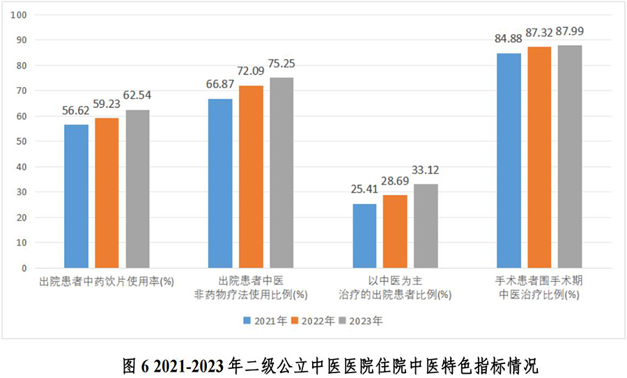 在住院中醫(yī)藥服務(wù)方面。2023年,全國(guó)二級(jí)公立中醫(yī)醫(yī)院出院患者中藥飲片使用率、出院患者使用中醫(yī)非藥物療法比例、以中醫(yī)為主治療的出院患者比例分別為62.54%、75.25%、33.12%,較2022年分別提高3.31、3.16、4.43個(gè)百分點(diǎn);手術(shù)患者圍手術(shù)期中醫(yī)治療比例為87.99%,較2022年提高0.67個(gè)百分點(diǎn)(見(jiàn)圖6)。